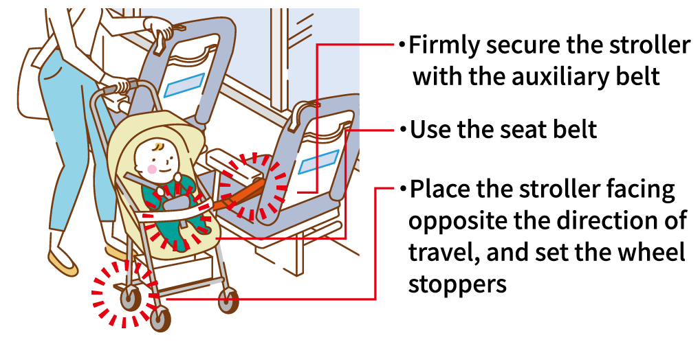 Baby strollers can be used on most buses operating in the Hakone area. However, strollers must be folded before boarding when the bus is crowded, when there are wheelchair users present, when there are other passengers with strollers, and if the baby stroller is larger than the standard size. Please note that wheelchairs have priority. Please inform the driver before boarding if you will be keeping your child in the stroller. The driver will open the middle door. Board the bus and place the stroller in the predeter-mined area.