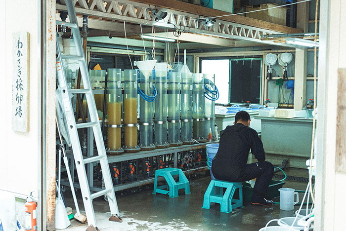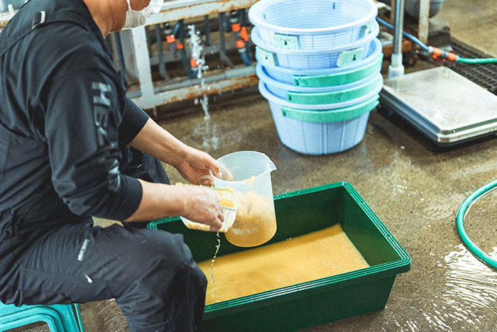Wakasagi is being brought to the hatchery one after another as we talk. The work is carried out quickly and carefully so as not to weaken the fish. We ask Mr Yosuke Yuki, who bends his large body and works silently with his hands, how many eggs he can get from a 50 kg haul. “The eggs you get from Wakasagi are about 10% of the catch, so 50 kg would be about 5 kg… 1 g contains 2000-2500 eggs, so 10-12.5 million,” he replies.