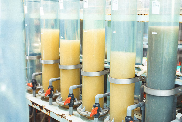 An incubation cylinder containing eggs. The far-right cylinder contains eyed eggs.
