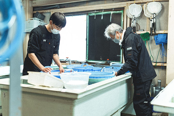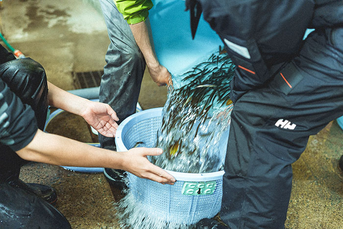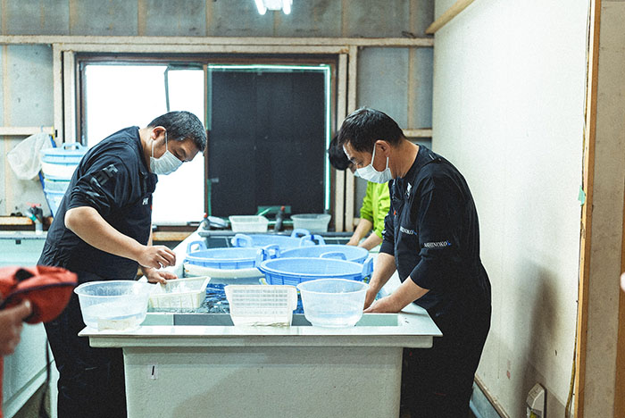 Beautiful Wakasagi are brought in one after another. Even though it is a familiar scene for the cooperative members, there is an uplifting atmosphere in the hatchery.
