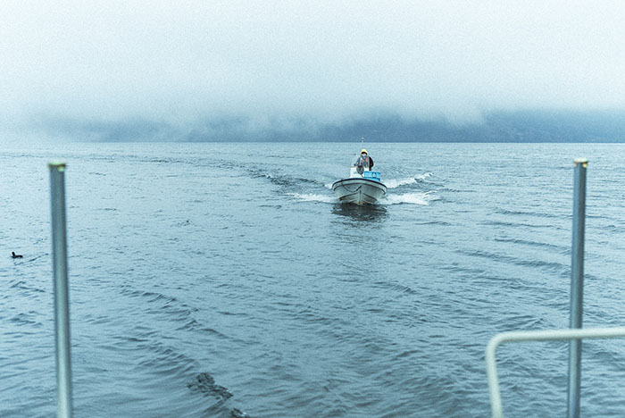 As soon as the fish are transferred, the two boats speedily move to the next point while Mr Fukui returns to the fish hatchery on the opposite shore. The mountain lake on a wet April day is still terribly cold. However, Mr Fukui heads along while humming a tune. For him, this is no comparison to a February day when the splashes that cover the body will instantly freeze.