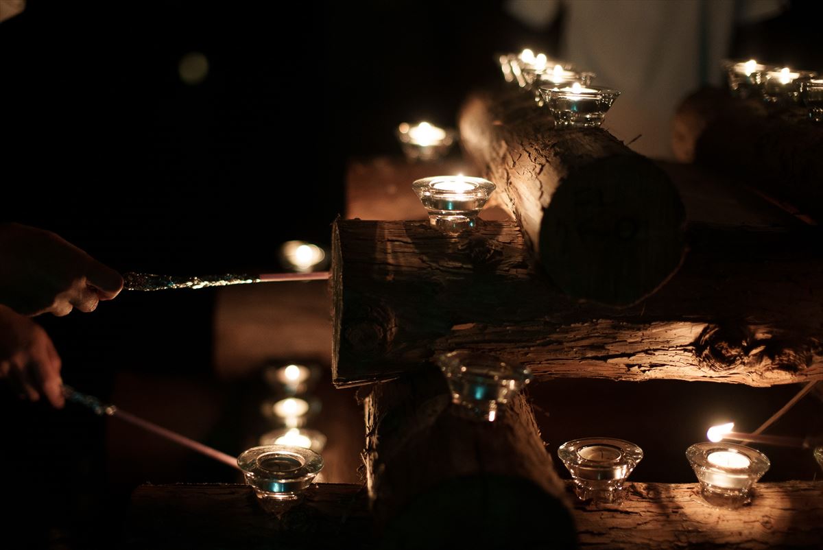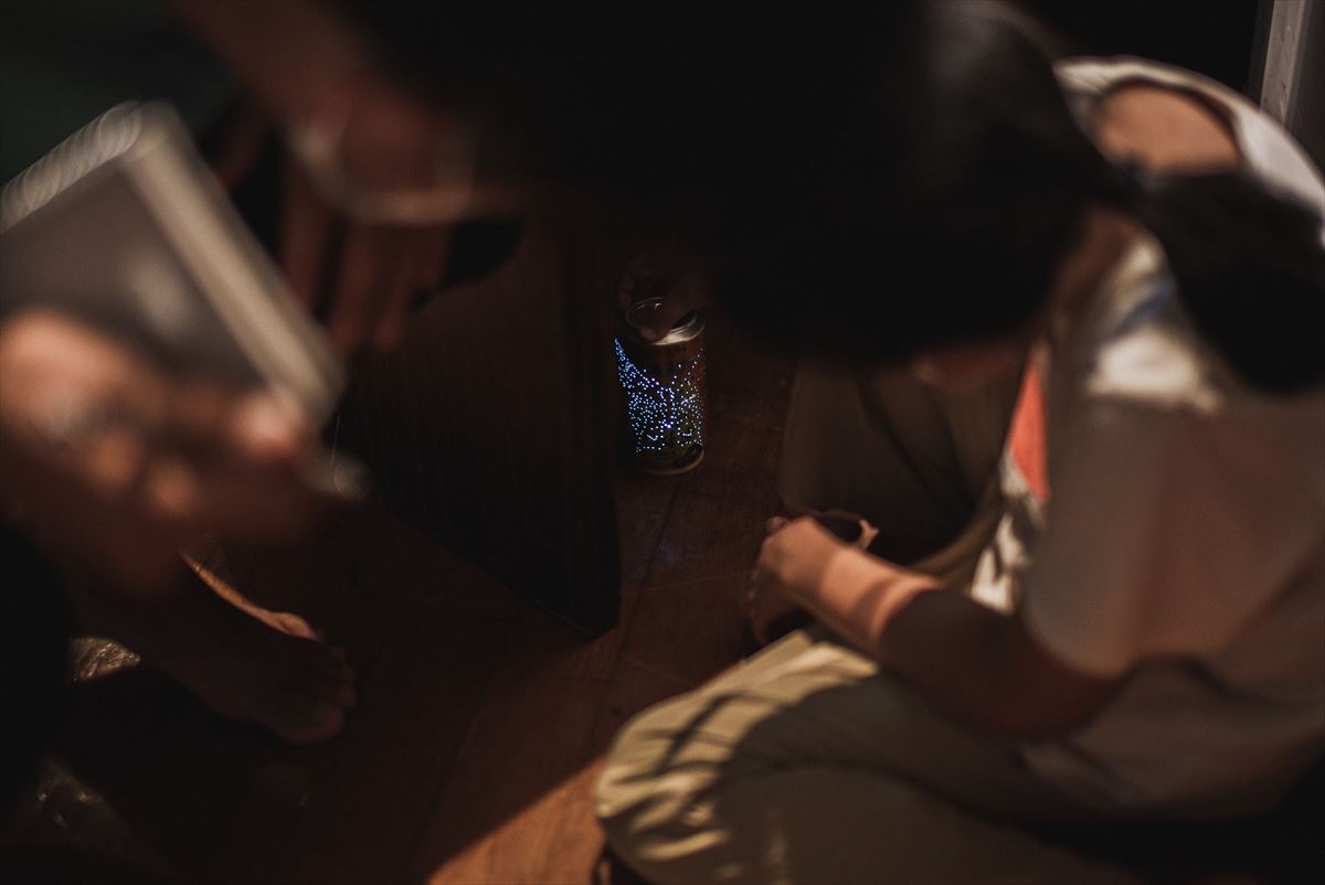 The map of Japan was made using a large rope. Each participant presented their favorite place and the reason for it. After that, they made lanterns out of empty tins. After the rain eased a little in the evening, we returned to the campsite to make hamburgers for dinner. Later, the candle-lanterns and tin-lanterns were lit, and we gathered around them.